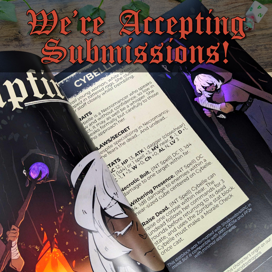 Over 75% of the content found in Everyday Dragons come from people like you, real everyday members of the TTRPG community! We want to hear from you! Content is not limited to D&D.